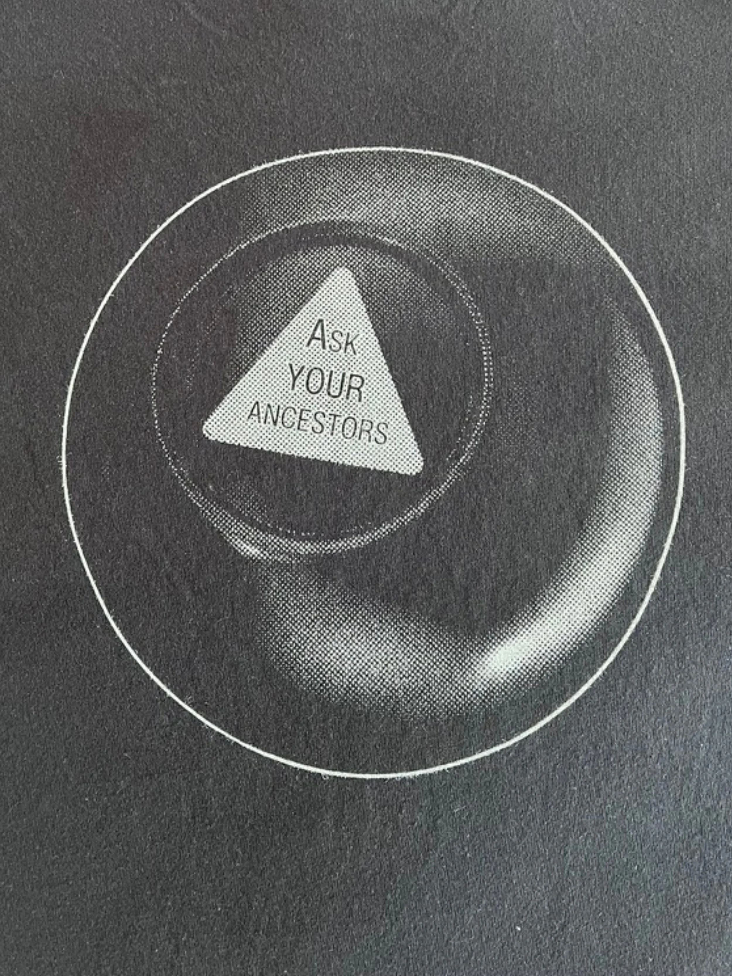 Categories: All TEES ART All / Ask Your Ancestors 8Ball Tee - CREME $60.00 Ask Your Ancestors 8Ball Tee- BLACK OR GREY $60.00 hayashi goods come from the high forests of consciousness and play.